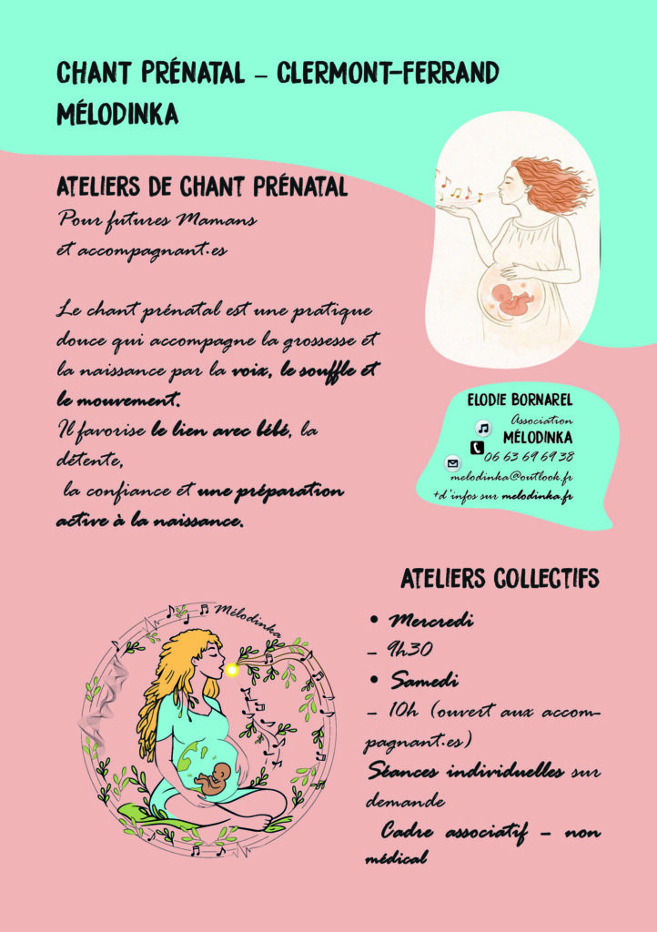 Bonjour ! Elodie Bornarel, je suis diplômée de l’école internationale de chant prénatal. Je propose prochainement: